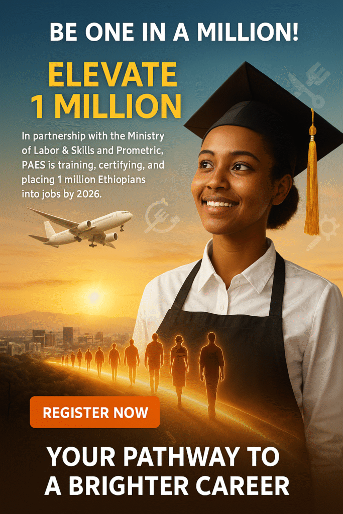 PAES, in partnership with the Ministry of Labor & Skills and Prometric, is launchingElevate 1 Million—a national initiative to train, certify, and place one million Ethiopians into dignified jobs by the end of 2026.